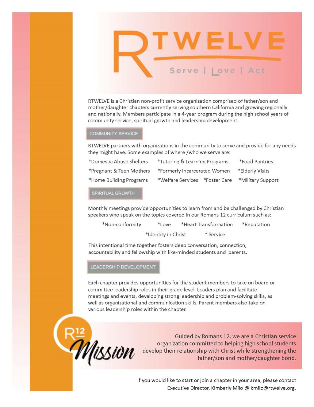 Guided by Romans 12, RTwelve is a Christian service organization committed to helping high school students develop their relationship with Christ while strengthening the mother/daughter bond.
